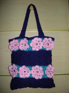 This is challenging. Require both crochet and knitting technique. The flowery part is a mortif that make up from pink yarn follow by aqua yarn for the base. Then sew the four motifs together to form a row. The purple part is made up of knit and peal knitting technique.
