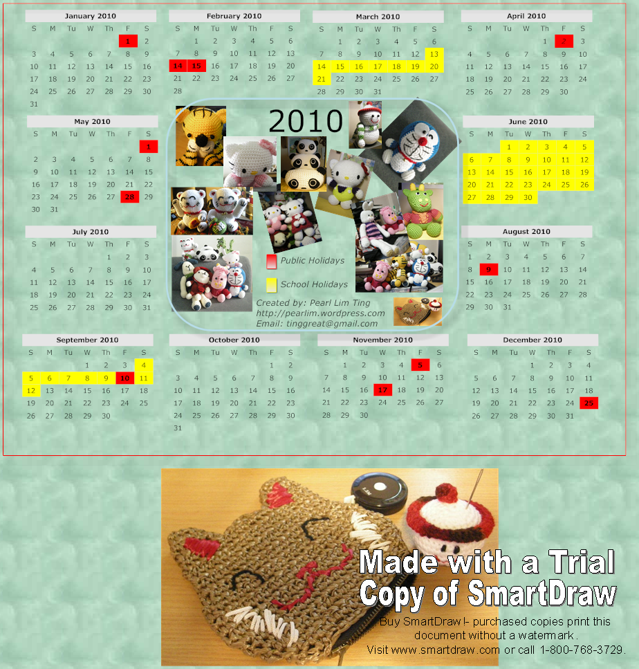 I recently came across the software, SmartDraw and use a trial version of the software to make 2010 calendar. Within two days, I have already completed making a yearly calendar and a monthly calendar with my favourites crochet dolls photos. See the below picture for the yearly calendar I’ve made: