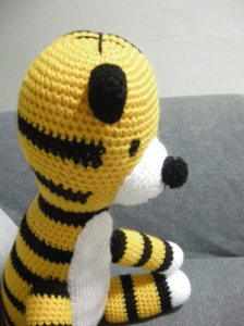 I have revised my Hobbes pattern to make the stripes of black on the back of the head by interchanging the yellow and black yarn instead of pasting another stripes of black on to the yellow crocheted head. Another of my Hobbes sale was made then.