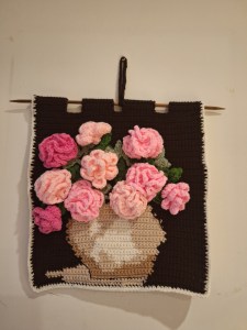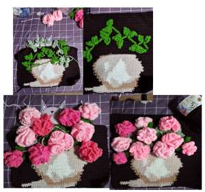 Well, it looks easy when you see the final product. However the planning and design stages took me quite a long time. To pick the right flower design took me sometime. The leaves ideas just comes with it once you have the crocheted flowers done. It only took me 2 days to crochet the back canvas (front and back) and assembling the flowers and leaves .