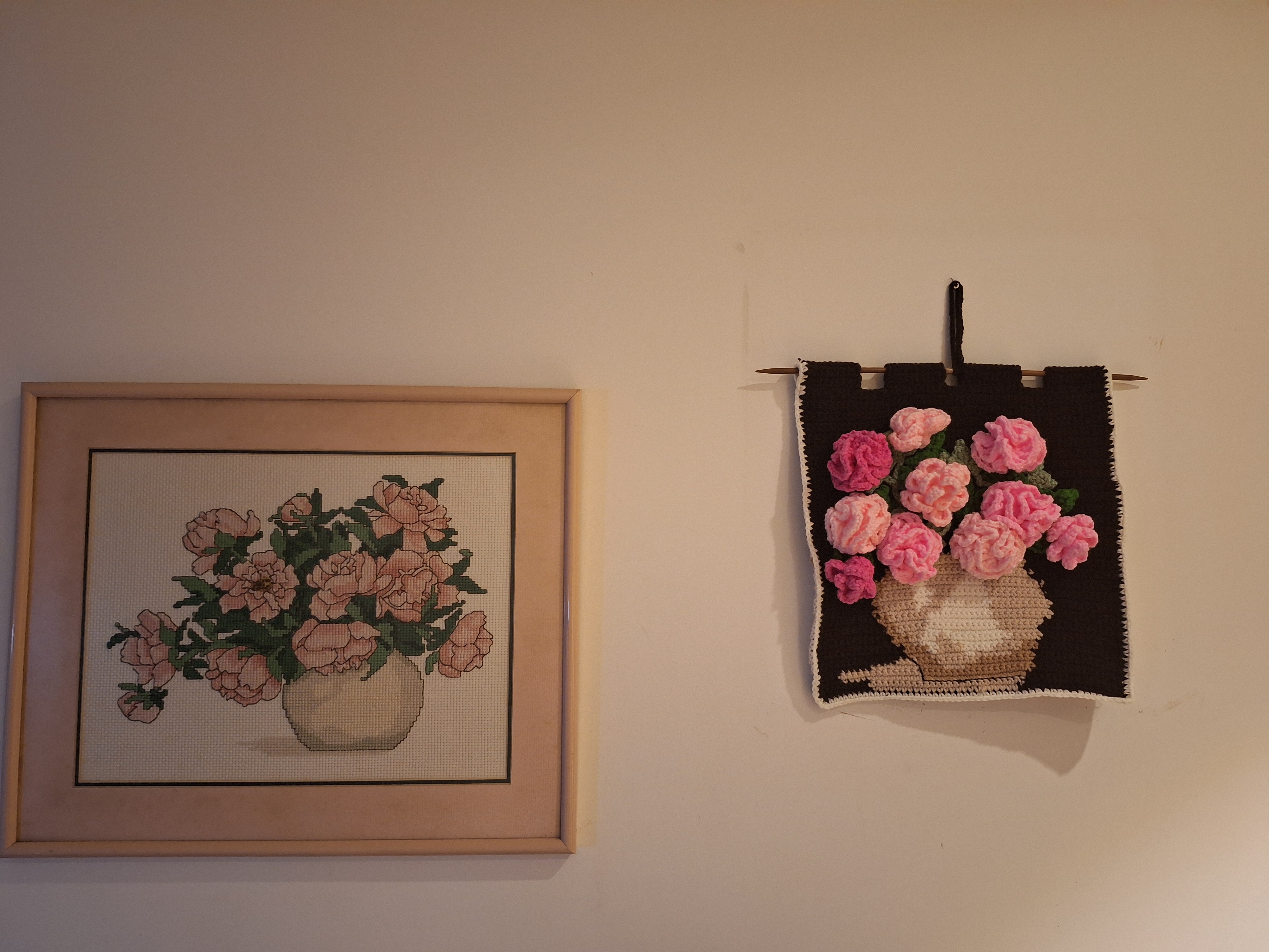 Well, it looks easy when you see the final product. However the planning and design stages took me quite a long time. To pick the right flower design took me sometime. The leaves ideas just comes with it once you have the crocheted flowers done. It only took me 2 days to crochet the back canvas (front and back) and assembling the flowers and leaves .