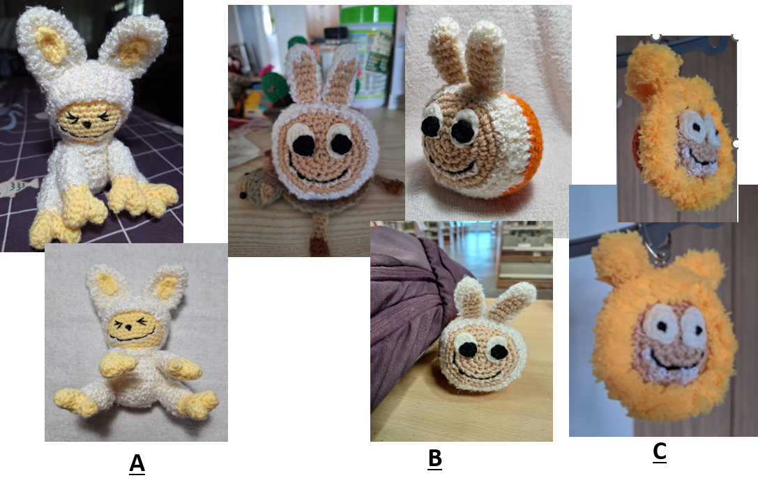 The character looks cute to me. so I started to mimic by crocheting amigurumi on this. I’ve created 3 versions, as shown in the picture below: